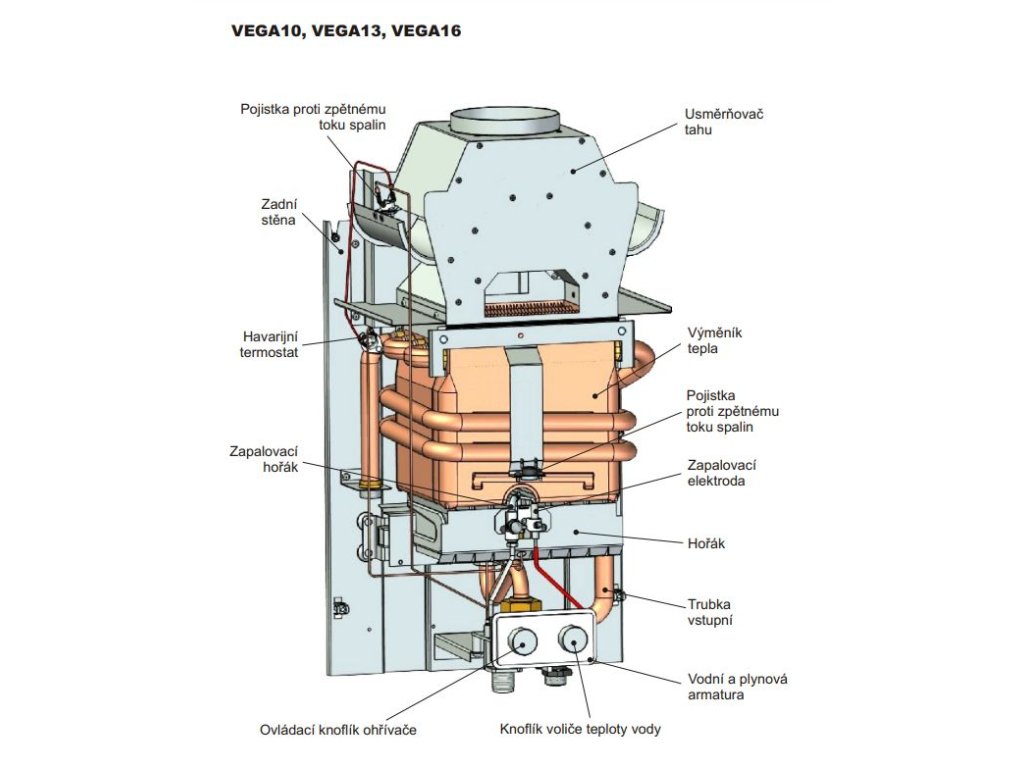Představujeme Vám velmi oblíbený a spolehlivý výrobek VEGA. Nástěnný plynový průtokový ohřívač je určen k ohřevu užitkové vody v domácnostech a kancelářích s tepelným výkonem 17,3 kW s průtokem 10l za minutu. Funkční sestavu ohřívače tvoří neměcká víceúčelová vodní a plynová armatura Mertik nejvyšší kvality, plynový hořák, zapalovací hořák a celoměděný výměník,který si společnost vyrábí sama v moderním závodě v Uničově. Měděné trubky v ohřívači mají největší průměr a tloušťku stěny (Ø18mm).