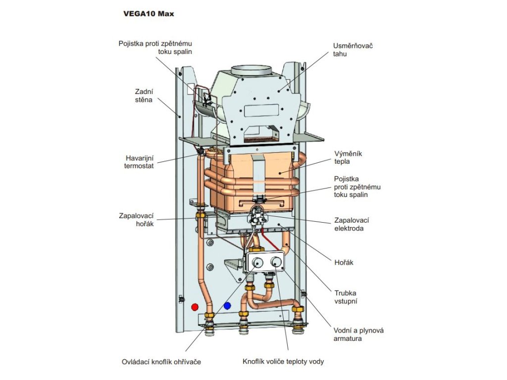 Představujeme Vám velmi oblíbený a spolehlivý výrobek VEGA MAX. Nástěnný plynový průtokový ohřívač je určen k ohřevu užitkové vody v domácnostech a kancelářích s tepelným výkonem 17,3kW s průtokem 10l za minutu. Funkční sestavu ohřívače tvoří neměcká víceúčelová vodní a plynová armatura Mertik nejvyšší kvality, plynový hořák, zapalovací hořák a celoměděný výměník,který si společnost vyrábí sama v moderním závodě v Uničově. Měděné trubky v ohřívači mají největší průměr a tloušťku stěny (Ø18mm).